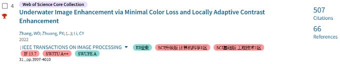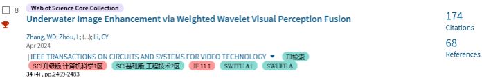 [2]     Zhang Weidong, Wang Muzi, Zhuang Peixian*, Liu Dahai*. Underwater Image Enhancement via Advantage Feature Weighted Fusion. IEEE Transactions on Circuits and Systems for Video Technology, 2025. (中科院1区,IF:11.1)