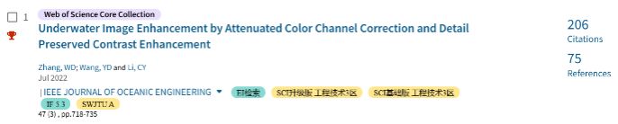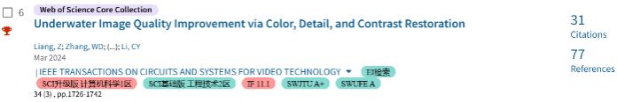 [1]     Zhang Weidong, Liu Qingmin, Lu Huimin, Wang Jianping, Liang Jing*. Underwater Image Enhancement via Wavelet Decomposition Fusion of Advantage Contrast. IEEE Transactions on Circuits and Systems for Video Technology, 2025. (中科院1区,IF:11.1)
