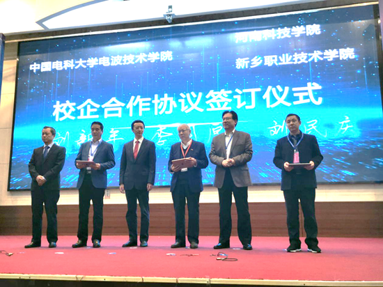 及新乡职业技术学院的校企合作签约仪式。冯启高与中国电科大学副校长郝政疆等共同见证了签约仪式。仪式结束后,冯启高与合作企业进行了深入交流,并介绍了学校特色优势和办学成果,希望双方在多个方面进一步加强交流与合作,不断提高校企合作的办学成效。