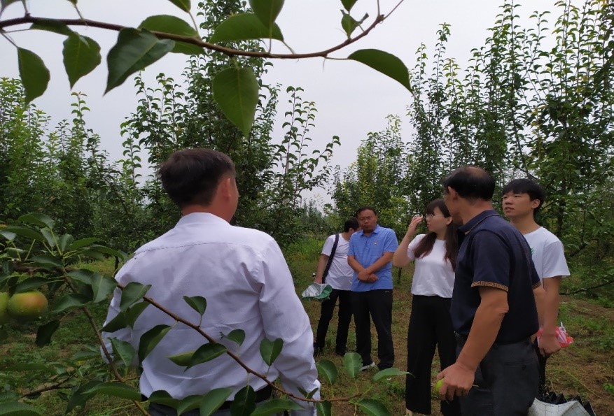 13日上午,在学校驻商水县扶贫联络员、校资产经营管理有限公司副总经理王锐的陪同下,帮扶组来到军转退休干部李旭辉的千亩梨园——和畅农场进行实地考察。重点商讨了帮助农场建设电商平台的事宜,帮扶组对果园贡梨品牌建设及销售宣传推广等工作也提出了相关意见和建议。