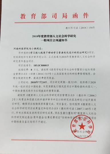 教师冯小燕博士主持申报的课题《学习投入视角下移动学习资源优化设计的实证研究》获得2018年度教育部人文社会科学研究青年基金项目立项。