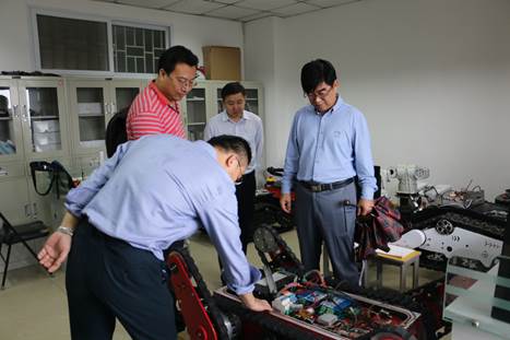 最后,李教授一行参观了机器人实验室,并观看了新研制的水陆两栖机器人实地演示。李教授对特种机器人后续的研发方向与思路给予了具体的指导,并对如何形成“人工智能+机器人”交叉学科优势给出了指导性意见。