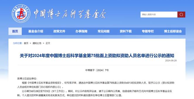 近日,根据中国博士后科学基金会《关于对2024年度中国博士后科学基金第75批面上资助拟资助人员名单进行公示的通知》,91天堂