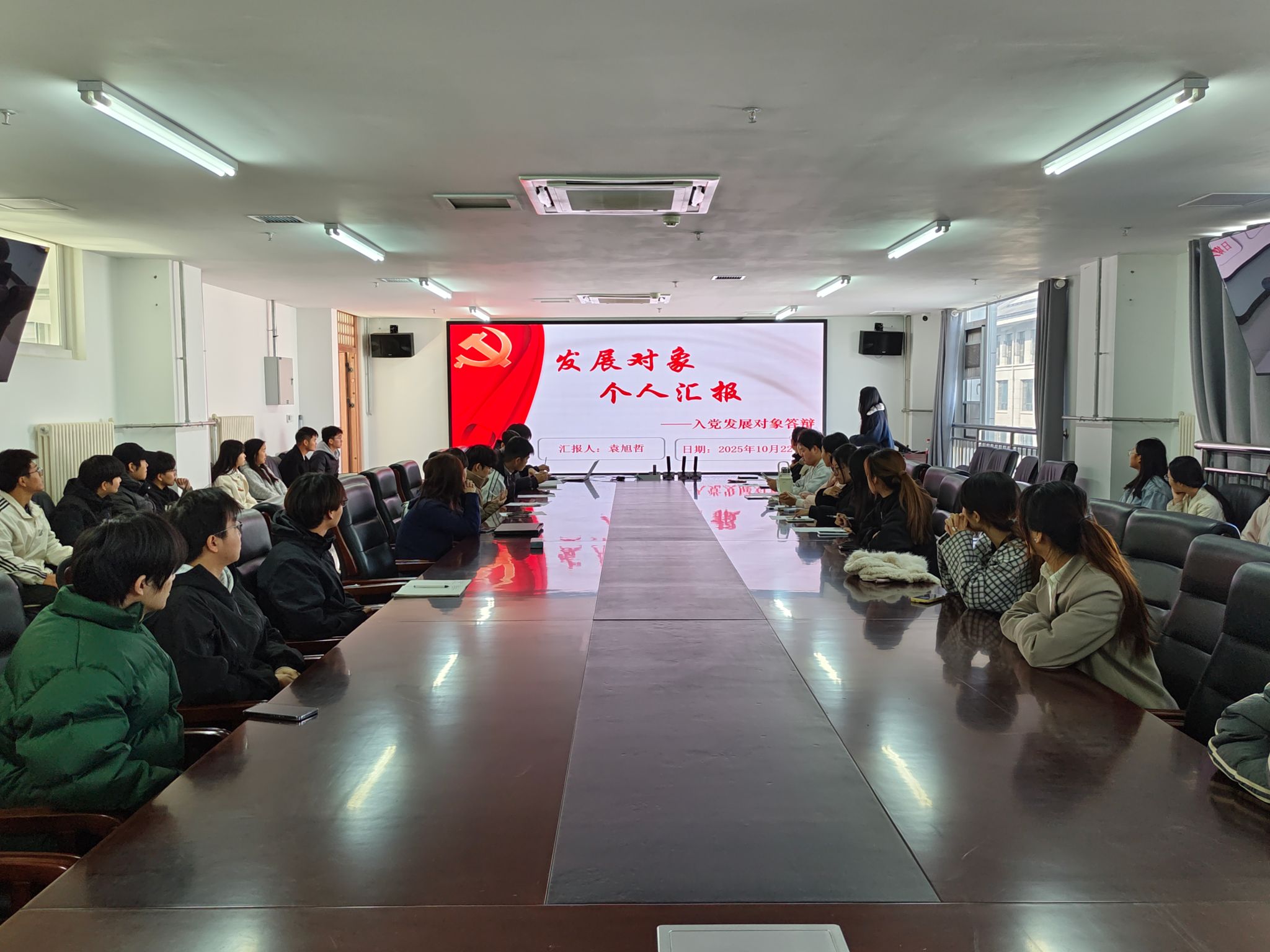 会上,申请人依次上台,通过精心准备的PPT,围绕个人基本情况、入党动机、对党的认识、思想动态、学业成绩以及自身优缺点等方面进行了全面汇报。他们结合自身在学习、竞赛、志愿服务和社会实践中的经历,表达了积极向党组织靠拢、争取早日成为一名光荣共产党员的坚定决心。汇报过程中,同学们精神饱满、思路清晰,充分展现了新时代青年学子积极向上、奋发有为的精神风貌。