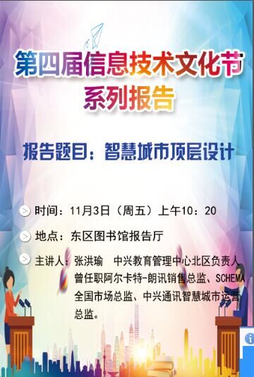第四届信息技术文化节系列报告报告题目:智慧城市顶层设计主讲人:张洪瑜 中兴教育管理中心北区负责人 曾任职阿尔卡特-朗讯销售总监、schema全国市场总监、中兴通讯智慧城市运营总监时间:11月3日(周五)上午10:20地点:东区图书馆报告厅