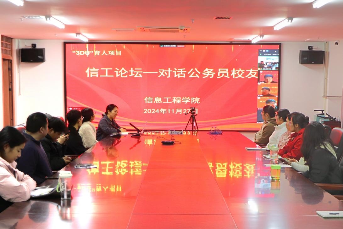 11月27日晚,开展“3DU”育人项目——信工论坛之对话公务员校友活动。学院党委副书记王明艳、五位优秀公务员校友以及22级、23级学生参加了此次活动。活动由王明艳主持。