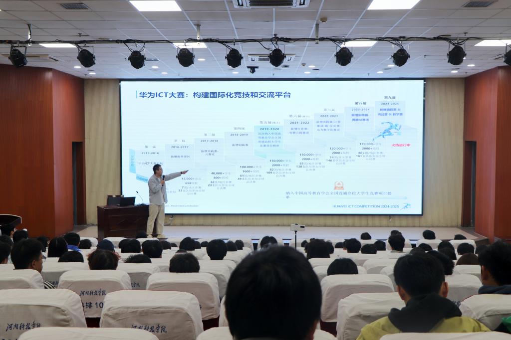 华为ICT大赛是华为公司打造的面向全球大学生的年度ICT赛事,旨在提升学生的ICT知识水平,加强学生的实践动手能力以及运用新技术、新平台的创新创造能力。河南云和数据信息技术有限公司作为华为技术有限公司ICT授权培训合作伙伴,受邀为学院学生开展讲座培训。通过此次活动,学生们将通过理论考试和实验考试,能够深入了解ICT比赛内容,提高ICT理论知识储备、上机实践能力以及团队合作能力,提高学生的理论知识水平和动手能力。