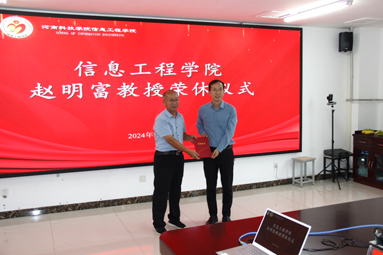 院长李国厚宣读了学校关于赵明富教授的荣休通知,详细介绍了赵明富教授的工作历程。研究生处长李波为赵明富教授颁发了荣休证书并赠送荣休纪念品。院长李国厚在发言中表示,希望赵明富教授在安享退休生活之余,继续建言献策、发挥余热,持续关心、关注和支持学院事业发展。